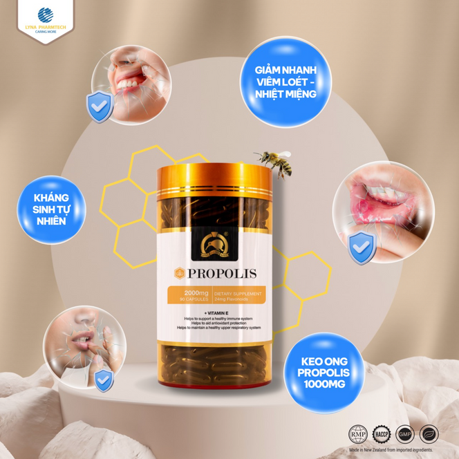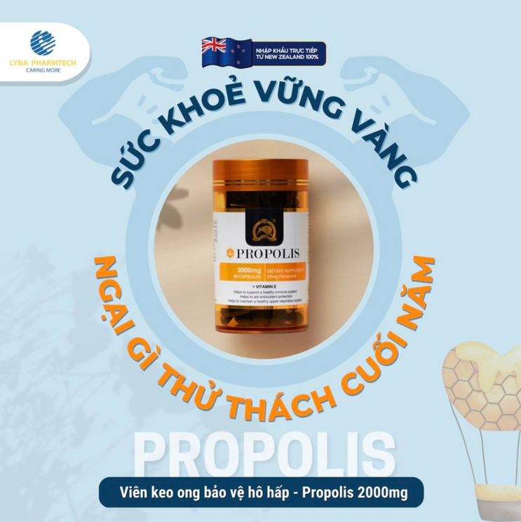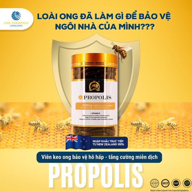 (Viên uống hỗ trợ tăng đề kháng - bảo vệ hô hấp Propolis) đến từ New Zealand 100% với công thức vượt trội kết hợp cùng keo ong tươi và vitamin E thiên nhiên mà không sản phẩm nào có được với 2 công dụng: