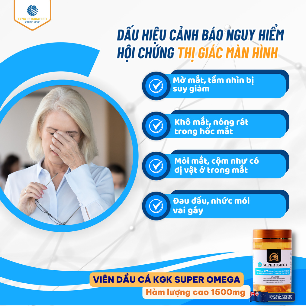 📊Cuộc sống số hóa đang khiến con người, đặc biệt là dân văn phòng phải tiếp xúc liên tục với các thiết bị điện tử chứa nguồn ánh sáng xanh nguy hiểm: màn hình máy tính, điện thoại, tivi.. Điều này là nguyên nhân dẫn đến hội chứng bệnh lý nghiêm trọng: HỘI CHỨNG THỊ GIÁC MÀN HÌNH. Những triệu chứng khó chịu như: 🔻Mờ mắt, tầm nhìn bị suy giảm. Nhìn 1 vật nhưng 2 ảnh. 🔻Khô mắt, nóng rát trong hốc mắt 🔻Mỏi mắt, cộm như có dị vật ở trong mắt 🔻Đau đầu, nhức mỏi vai gáy.. 👉Theo Tổ chức Y tế Thế giới (WHO), chỉ cần tiếp xúc với màn hình của các thiết bị điện tử trên 3️⃣giờ mỗi ngày, mắt sẽ có 90% nguy cơ bị suy giảm thị lực. 🚨Thực trạng này gióng lên hồi chuông báo động về việc suy yếu thị lực và nguy cơ dẫn đến mù lòa do mắt bị tác động bởi ánh sáng xanh. 🔴Cần chủ động chăm sóc, bảo vệ võng mạc từ bên trong bằng cách bổ sung Omega -3 (DHA/EPA) giúp nuôi dưỡng mắt sáng khỏe từ bên trong. 👉Lyna Pharmtech khuyến cáo nên chọn KGK Super Omega từ New Zealand bởi: ✅Sản phẩm thuộc nhà máy sản xuất Omega-3 lớn nhất thế giới, top nhà máy hiếm hoi cung cấp Omega-3 tinh khiết chính phẩm. ✅Hàm lượng cao gấp 3 lần sản phẩm cùng dòng (1500mg). Sở hữu tỉ lệ vàng tốt cho Mắt - não bộ - Tim mạch. 👉Đôi mắt là cửa sổ tâm hồn! Bảo vệ đôi mắt là bảo vệ tương lai của chính bạn! #SuperOmega #Baovemat #Lynapharmtech #Droppii